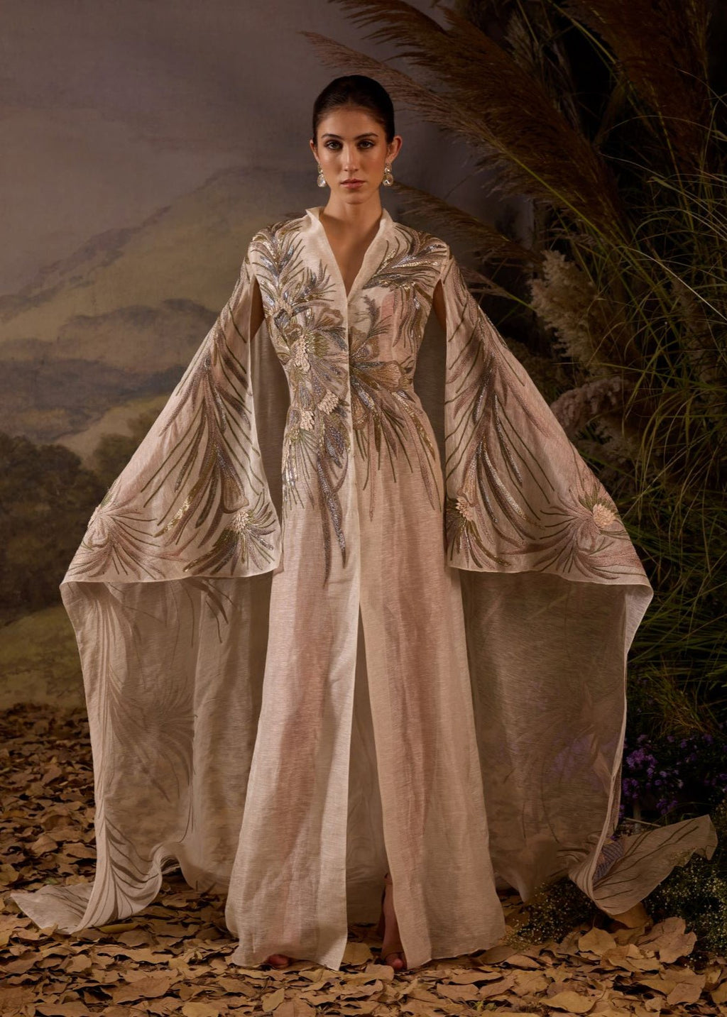 Make a statement in this ethereal embroidered gown, featuring a flowing silhouette and a sheer cape overlay adorned with intricate metallic threadwork. Delicate and regal, this ensemble is perfect for weddings, festive occasion...