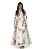 Ivory floor-length cotton silk gown that is adorned with silk yarn embroideries. It is given a Lapel neckline fit with an open front.
