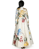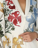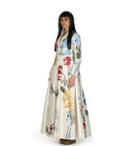 Ivory floor-length cotton silk gown that is adorned with silk yarn embroideries. It is given a Lapel neckline fit with an open front. Color: Ivory Fabric: Cotton Silk Care Instructions:...