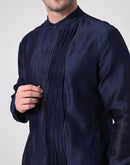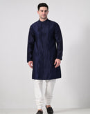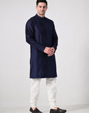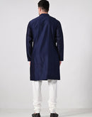 Make a bold style statement with this elegant navy blue kurta featuring intricate front panel detailing. Tailored from a glossy fabric for a premium look, it includes a mandarin collar and button placket. Paired with a white churidar, it's the perfect outfit for festive events, weddings, or cultural celebrations.