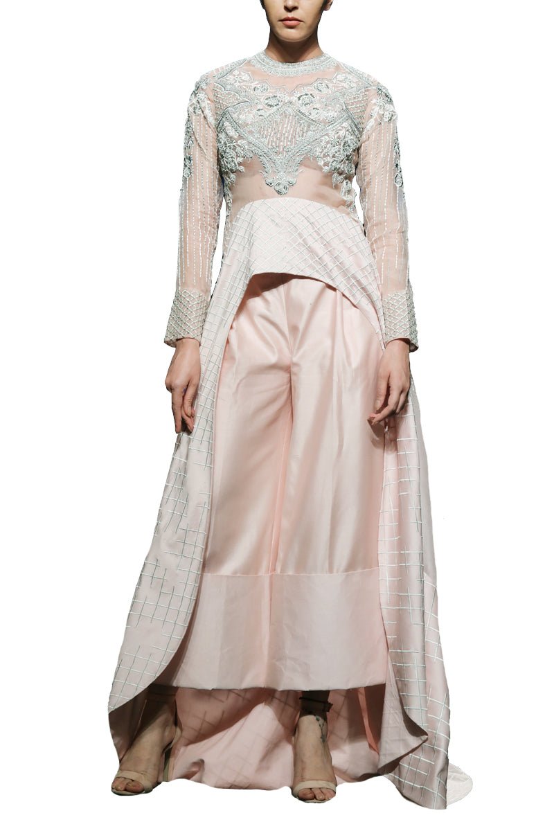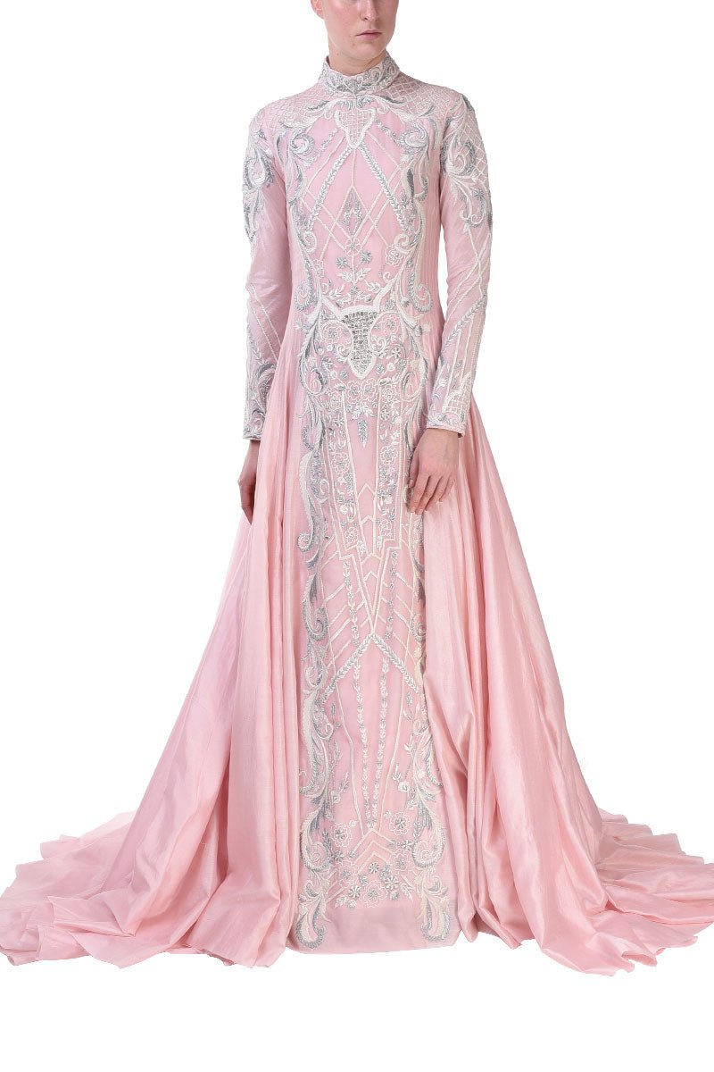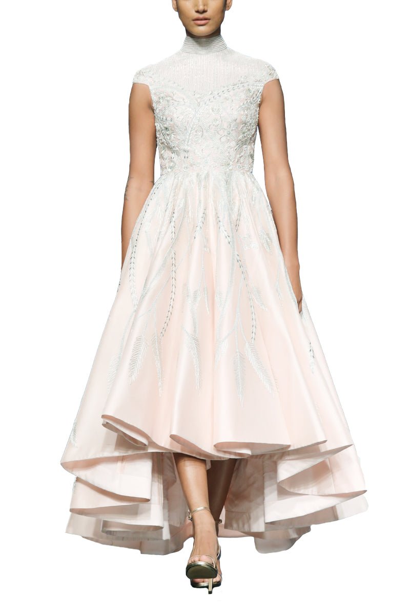 Powder Pink mandarin collar fit & flare, high-low gown that has box pleats and is embroidered in floral motifs of silk & zari yarn.Color: Powder PinkFabric: ChanderiCare Instructions: Dry Clean Only.