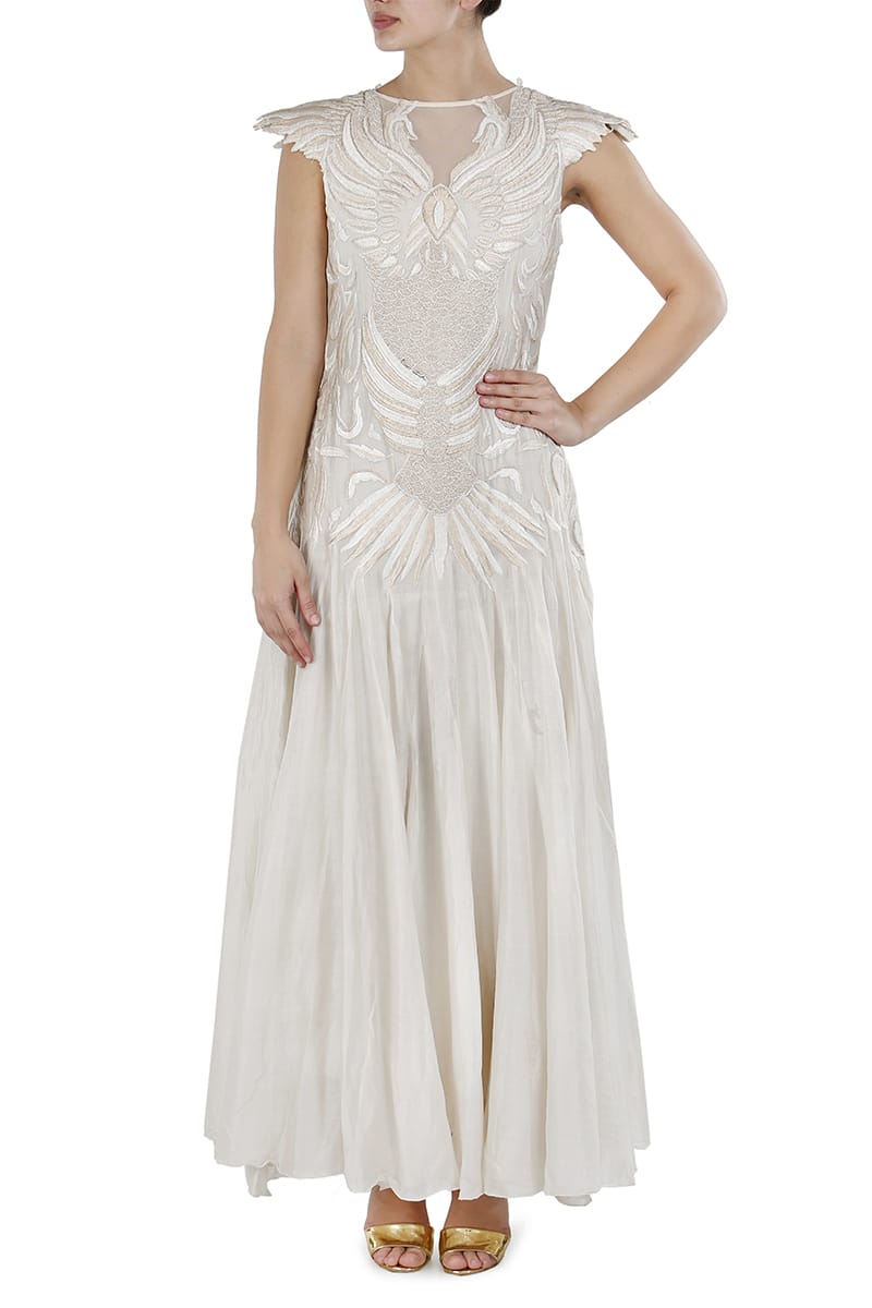 An ivory fit & flare floor-length Cotton Silk Gown showcasing tone-on-tone embroidery of bird motifs in silk yarn.