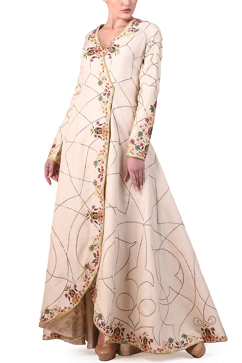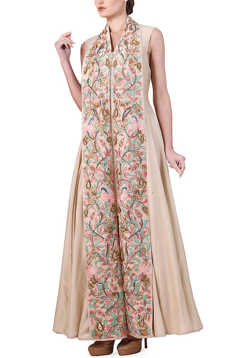 Beige panelled front zipper opening jacket Gown, embroidered in colourful silk yarn & zari work.