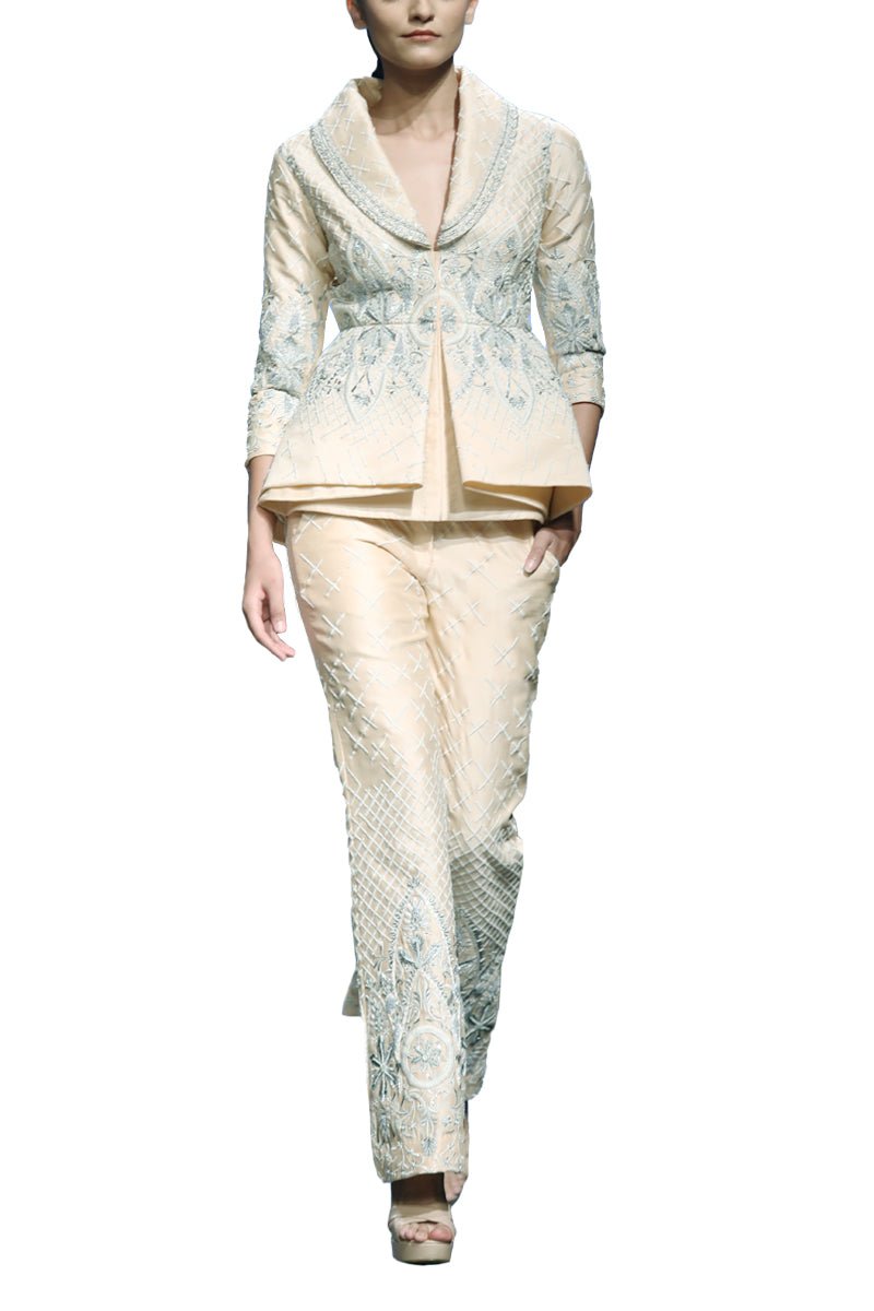 Ivory organza embroidered top, powder blue chanderi pants & embroidered front open long jacket.Color: Ivory, Powder BlueFabric: Organza & ChanderiCare Instructions: Dry Clean Only.