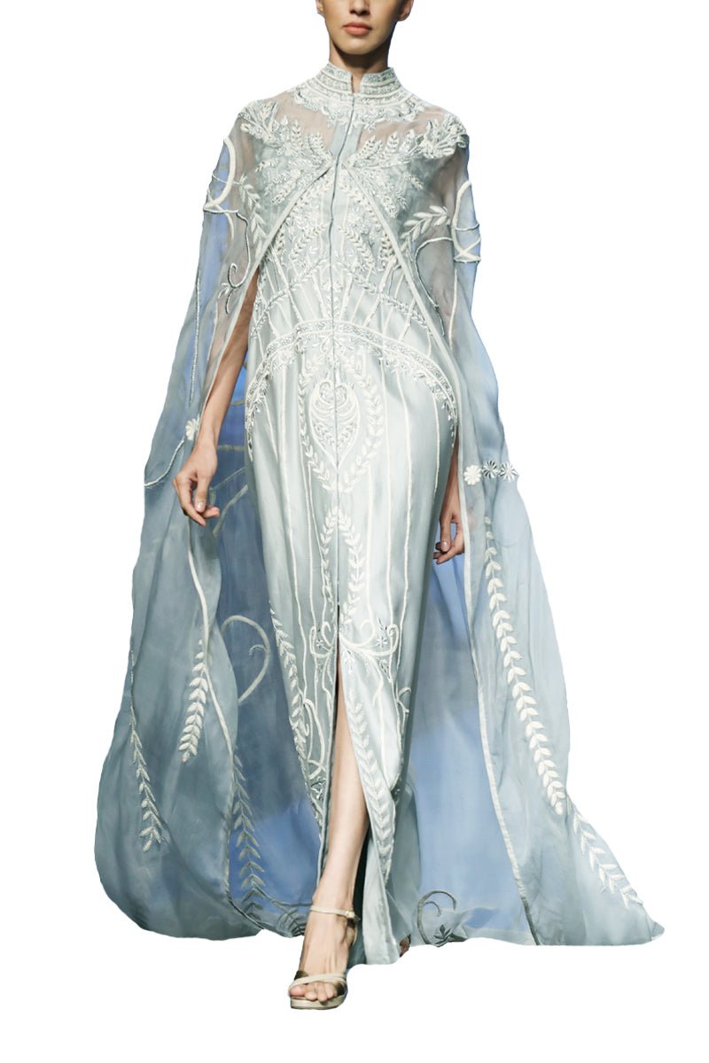 Ice Blue front-opening collar attached embroidered trail chanderi & organza dress.Color: Ice BlueFabric: Chanderi & OrganzaCare Instructions: Dry Clean Only.