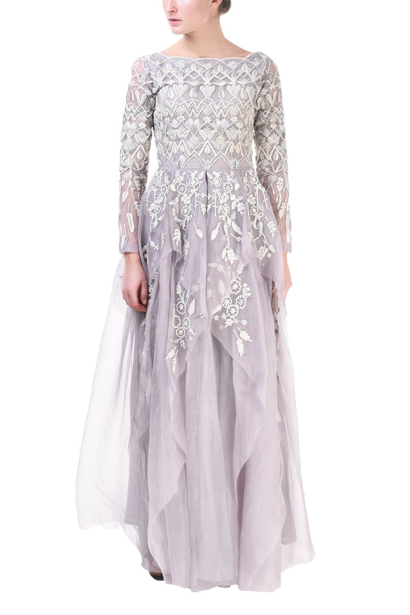 Icy lilac fit & flare asymmetric flowy organza gown embroidered motifs in silk & zari yarn.Color: Icy LilacFabric: OrganzaCare Instructions: Dry Clean Only.