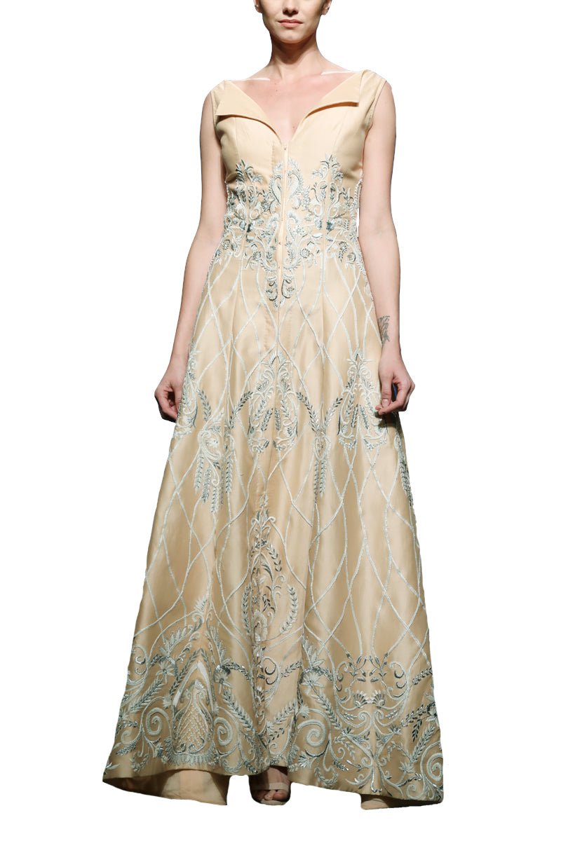 Beige overlap V-neckline, fit & flare front opening asymmetric hemline Cotton Silk Gown embroidered in geometric & floral motifs of silk & zari yarn.