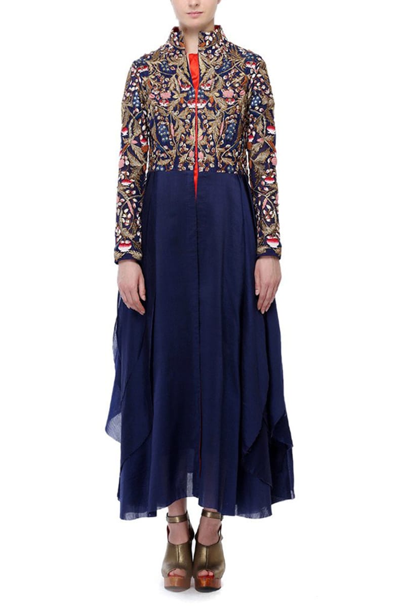 High collared Navy blue asymmetric hemline cotton silk dress, embroidered in silk yarn, sequins & zari work.