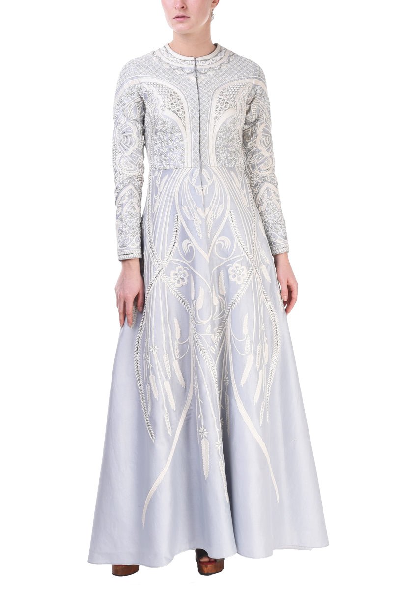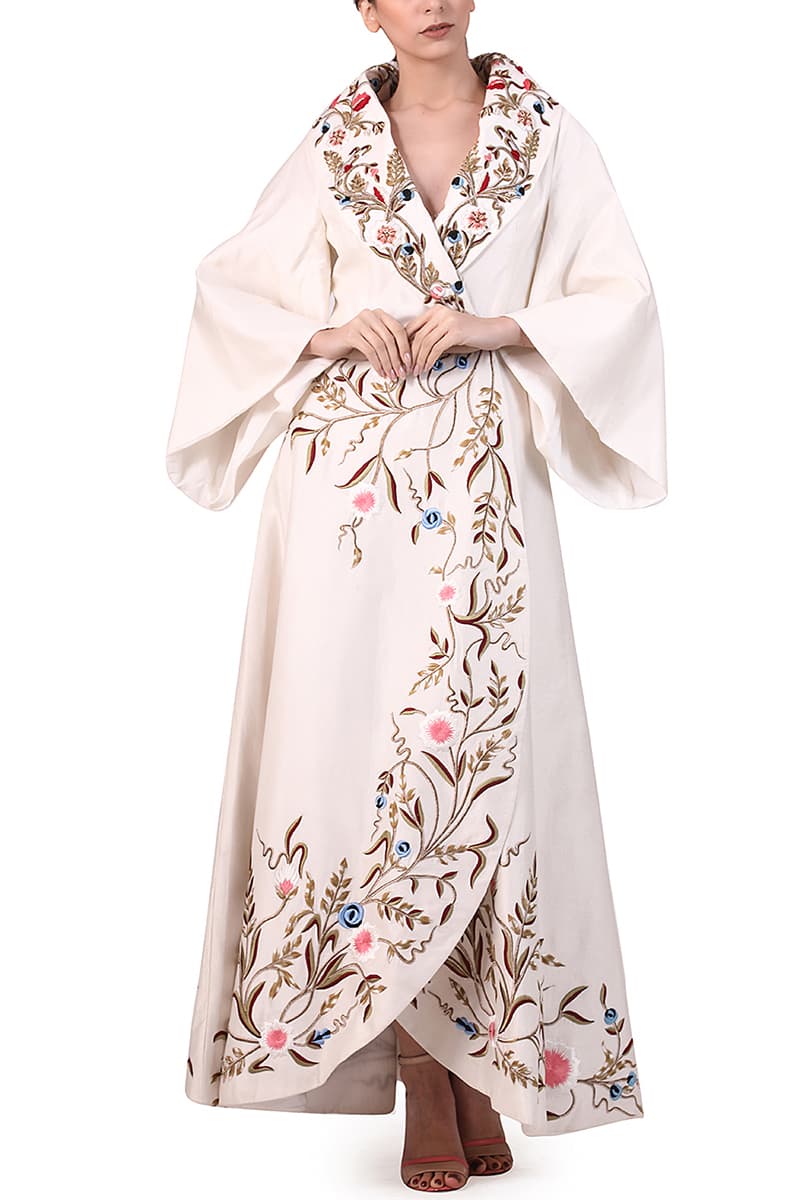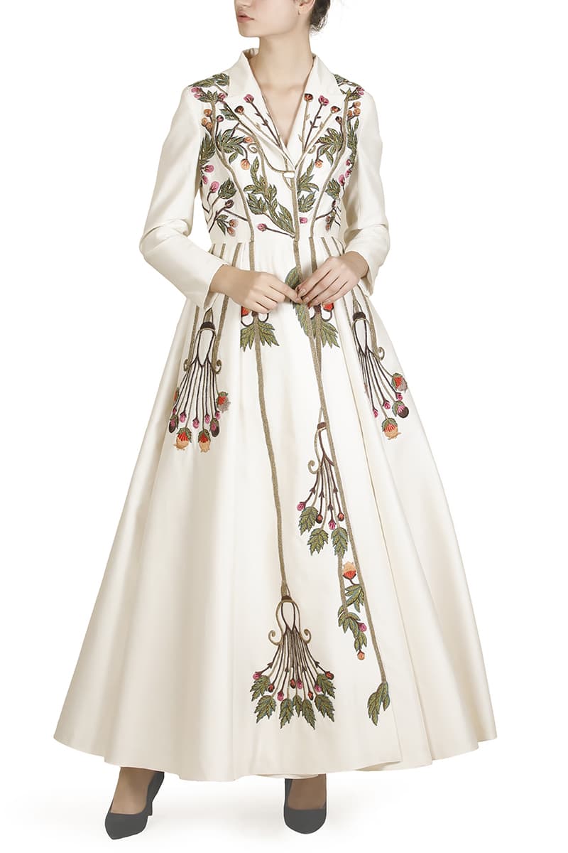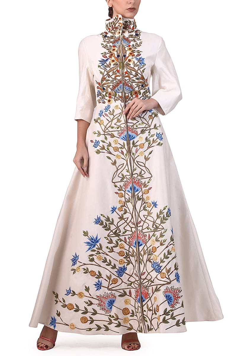 Ivory high-collared, front-opening jacket style floor-length Cotton Silk Gown embroidered in silk & zari yarn.