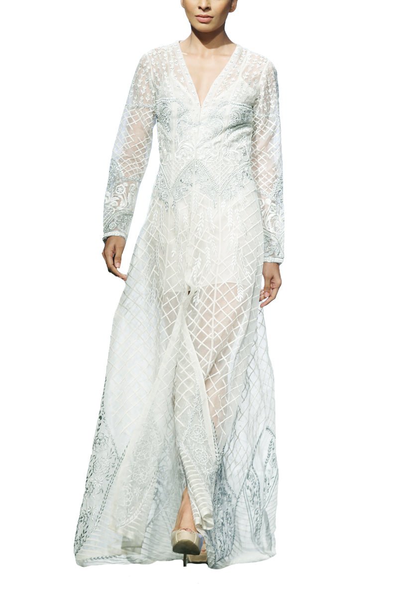 Ivory collared mesh panel detailing cotton silk Gown embroidered floral motifs of silk & zari yarn.Color: IvoryFabric: Cotton Silk & MeshCare Instructions: Dry Clean Only.