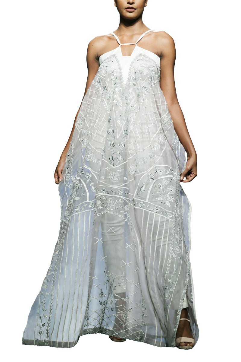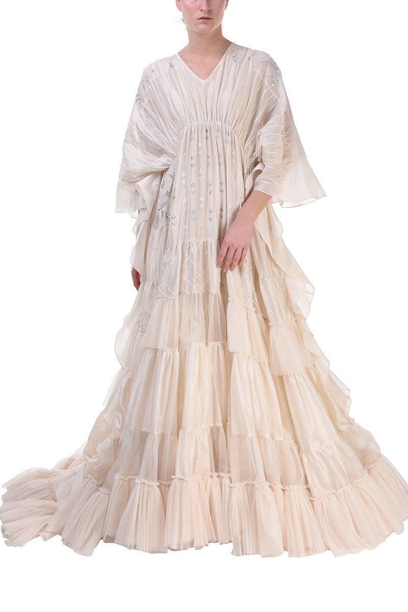 Ivory tiered embroidered kaftan gown.Color: IvoryFabric: Chanderi & OrganzaCare Instructions: Dry Clean Only.
