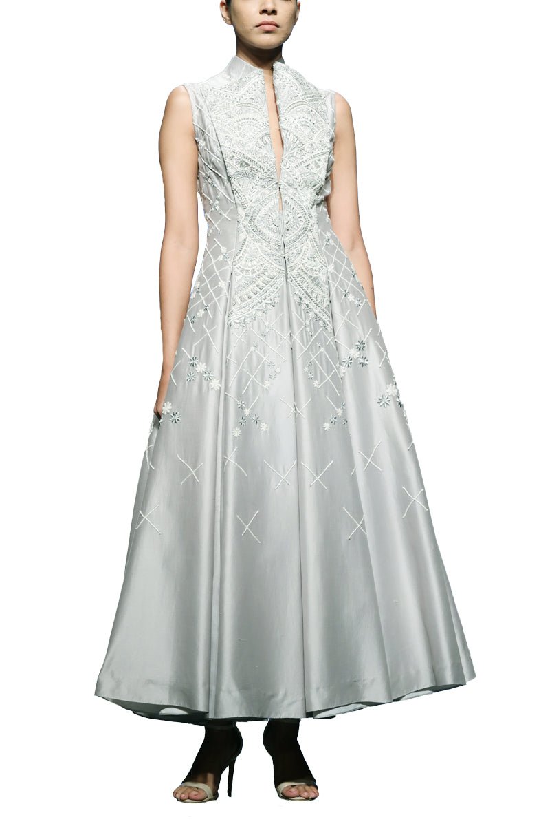 Ice grey front-opening lapel collar embroidered fit & flare chanderi gown.Color: Ice GreyFabric: ChanderiCare Instructions: Dry Clean Only.