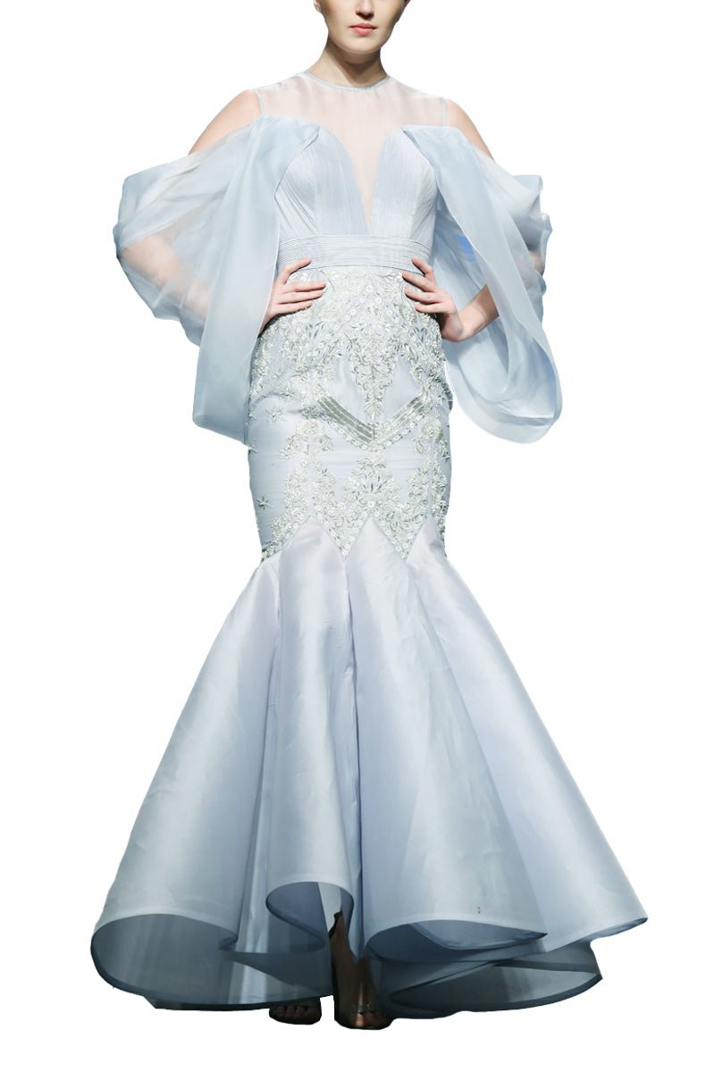 Ice Blue fit & flare off-shoulder mermaid gown embroidered in floral motifs of silk & zari yarn.Color: Ice BlueFabric: Chanderi & OrganzaCare Instructions: Dry Clean Only.