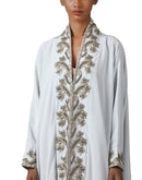Light blue floor-length front open neckline satin silk kaftan zari yarn & handwork embroidery.