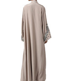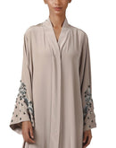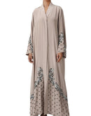 Light beige floor-length overlap neckline flare satin silk kaftan zari yarn & stonework embroidery.
