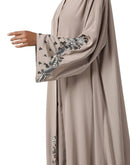 Light beige floor-length overlap neckline flare satin silk kaftan zari yarn & stonework embroidery.Color: Light BeigeFabric: Satin SilkCare Instructions: Dry Clean Only Delivery time: 3-4 weeks