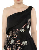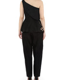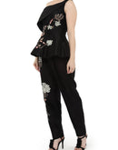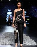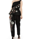 One shoulder, corset-style peplum top with pants in cotton silk that is embellished in thread embroidery.