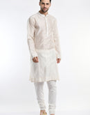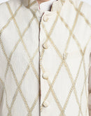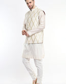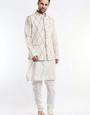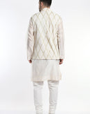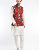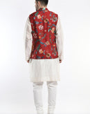 A cotton silk ivory kurta with matching cotton churidar that is topped with a reversible waist coat which is surfaced with digital print on red and quilted texture.