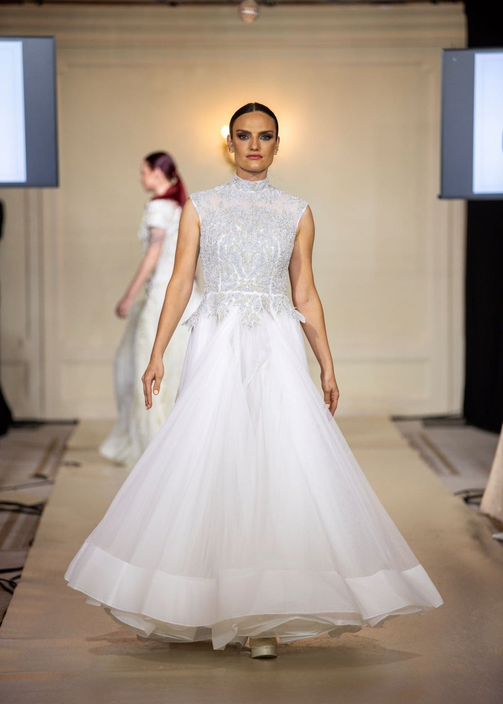 This sleeveless gown features a high-neck embroidered bodice with intricate silver detailing and a flared tulle skirt with a structured hem