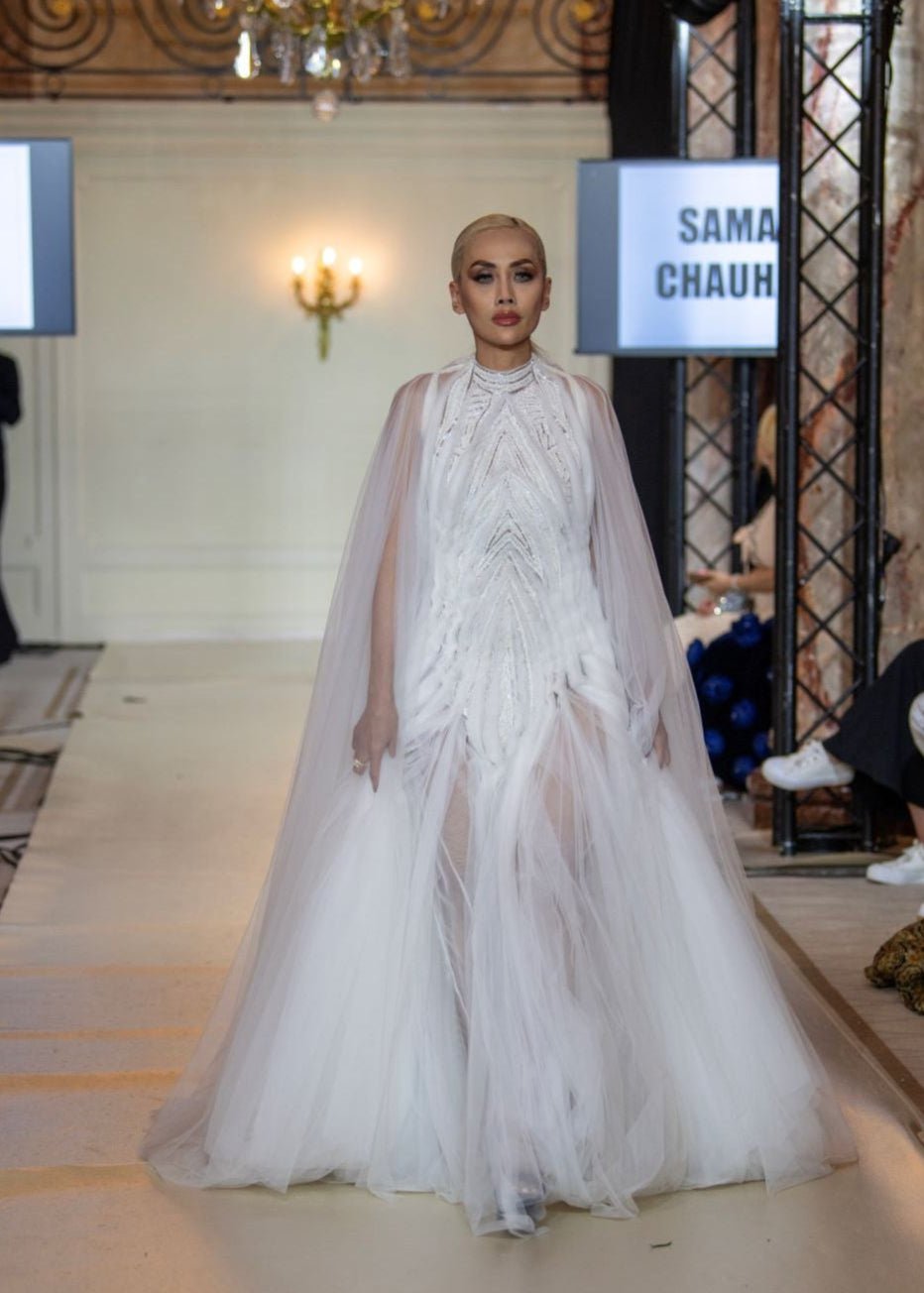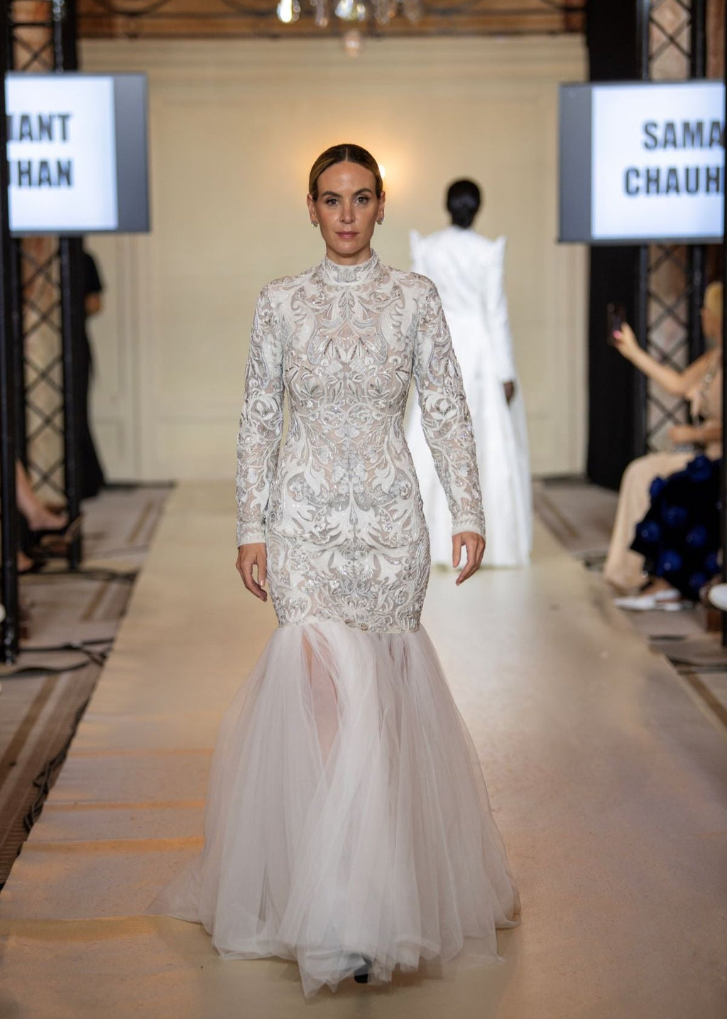 Exude timeless elegance in this high-neck gown featuring intricate silver embroidery and a form-fitting silhouette. The design transitions into a soft tulle mermaid skirt
