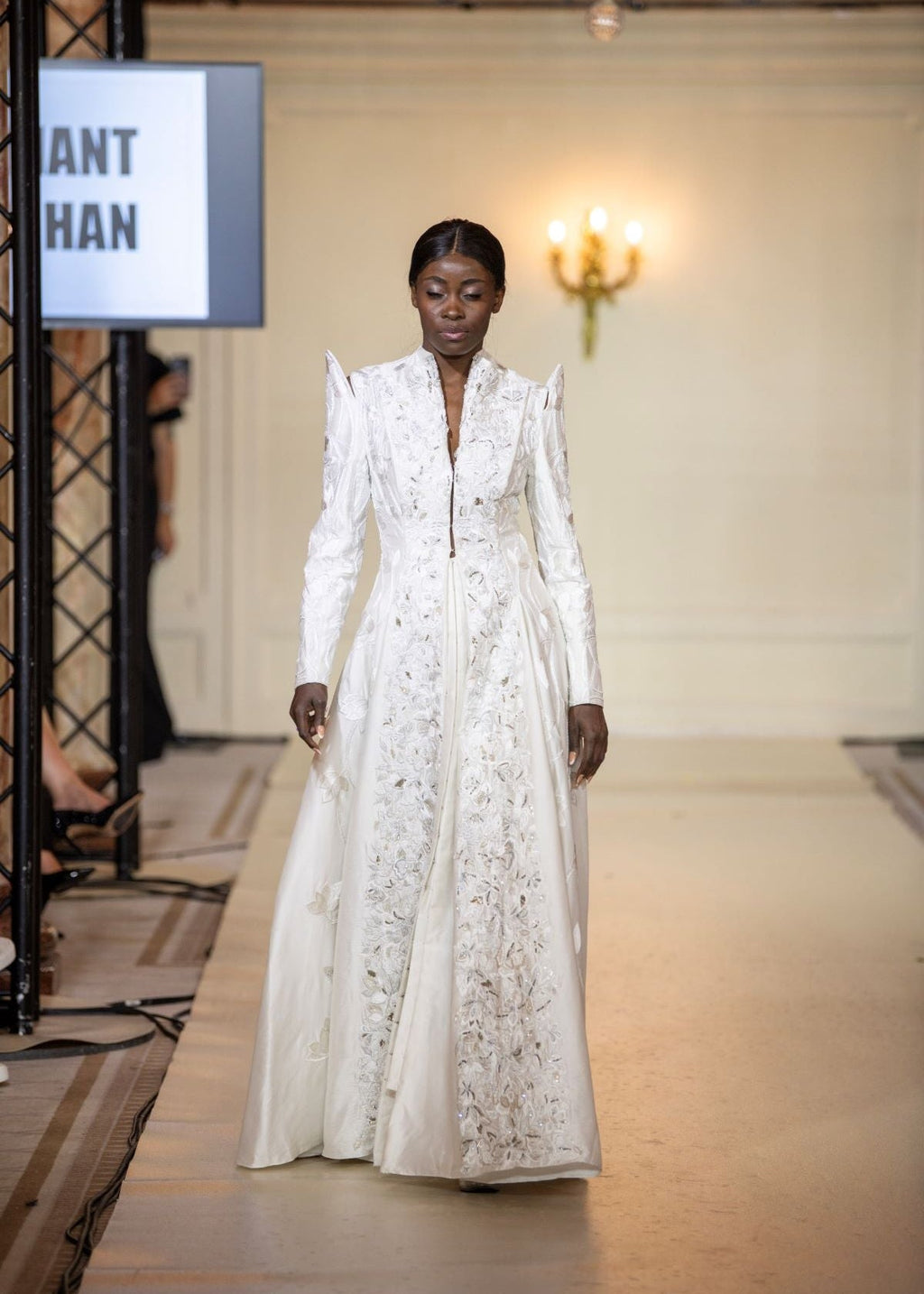 This exquisite gown features a sculpted bodice with ornate bead and thread embroidery, paired with a voluminous pleated skirt in a soft ivory tone
