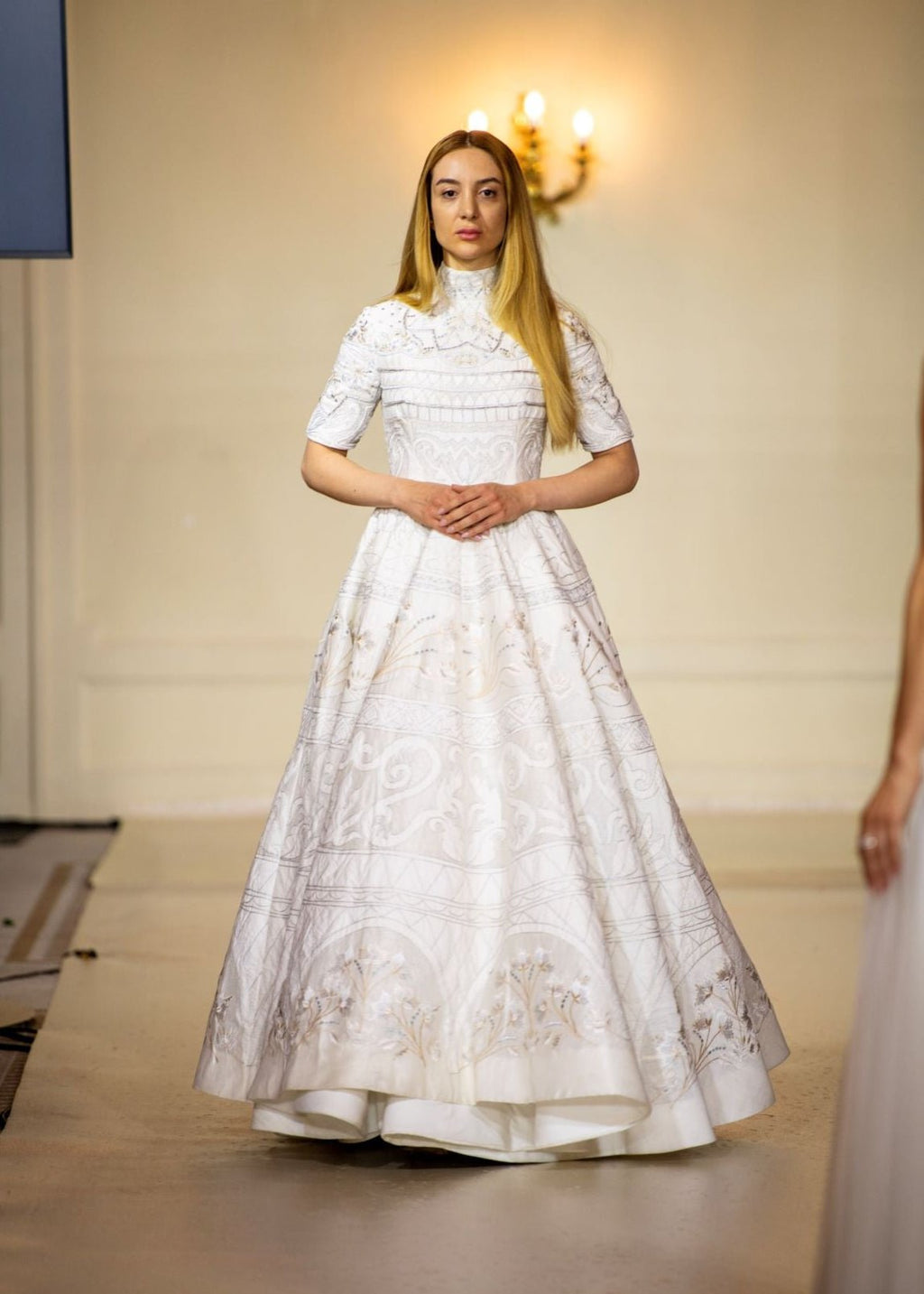 this high-neck gown features half sleeves and intricate threadwork across a voluminous flared silhouette. The soft sheen and subtle embroidery
