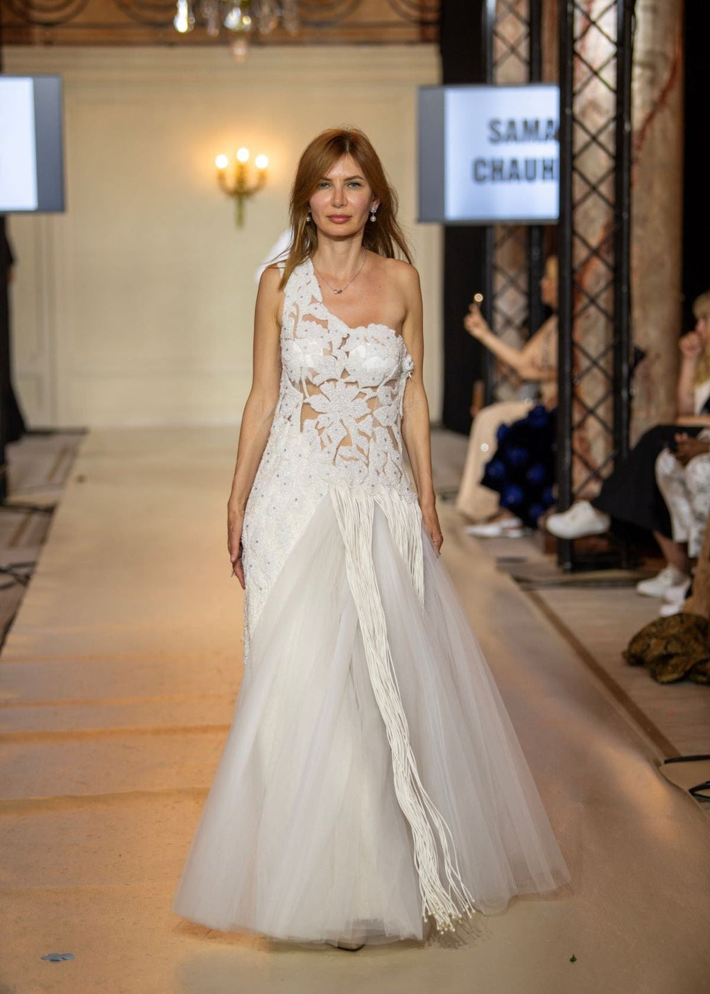 This one-shoulder ivory gown features intricate floral appliqué with sheer paneling and a flared tulle insert, blending elegance with modern flair