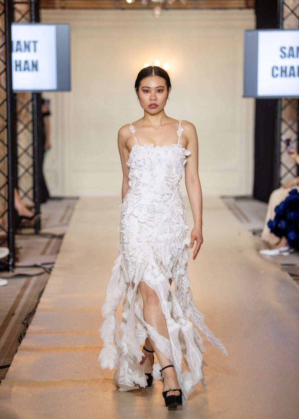 Turn heads in this strappy white gown featuring delicate 3D floral appliqués and a dramatic high-slit hem. The asymmetrical textured layers add a whimsical, nature-inspired touch