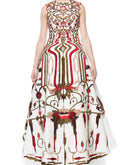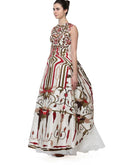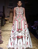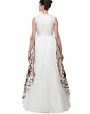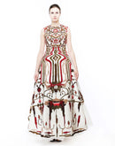 Ivory fit & flare floor-length Cotton Silk Gown embroidered geometric & floral motifs of silk & zari yarn.