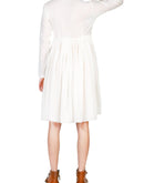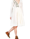 Featuring an ivory overlap neckline gathered waist with silk yarn embroidery detailing.