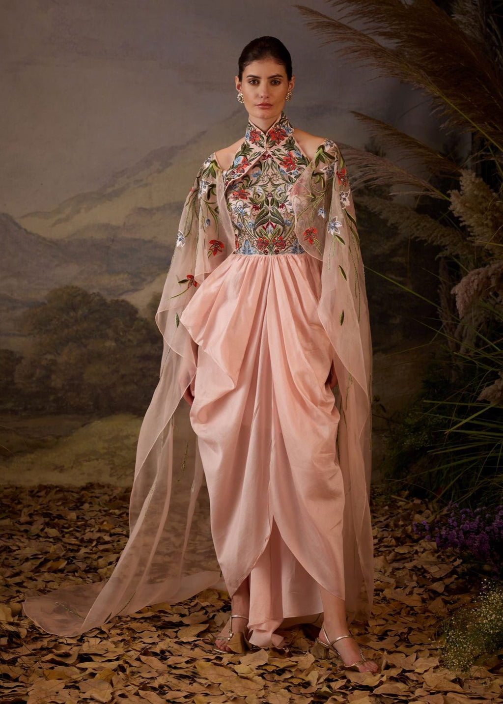 Make a statement in this ethereal blush pink gown featuring intricate floral embroidery, a chic halter neckline, and elegant cape sleeves