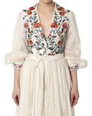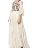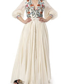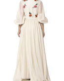 A floor-length Ivory dress in cotton silk with flare and balloon sleeves showcases embroidered floral motifs on the yoke with an angarakha neck.