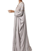 Light grey floor-length flare satin silk kaftan colorful silk yarn embroidery.