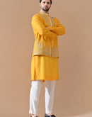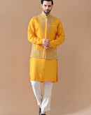 A vibrant yellow waistcoat set crafted in cotton silk and paired with a silk kurta, adorned with intricate hand embroidery that brings a rich elegance to dressing.
