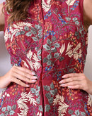 Make a statement with this exquisite maroon sleeveless peplum jacket