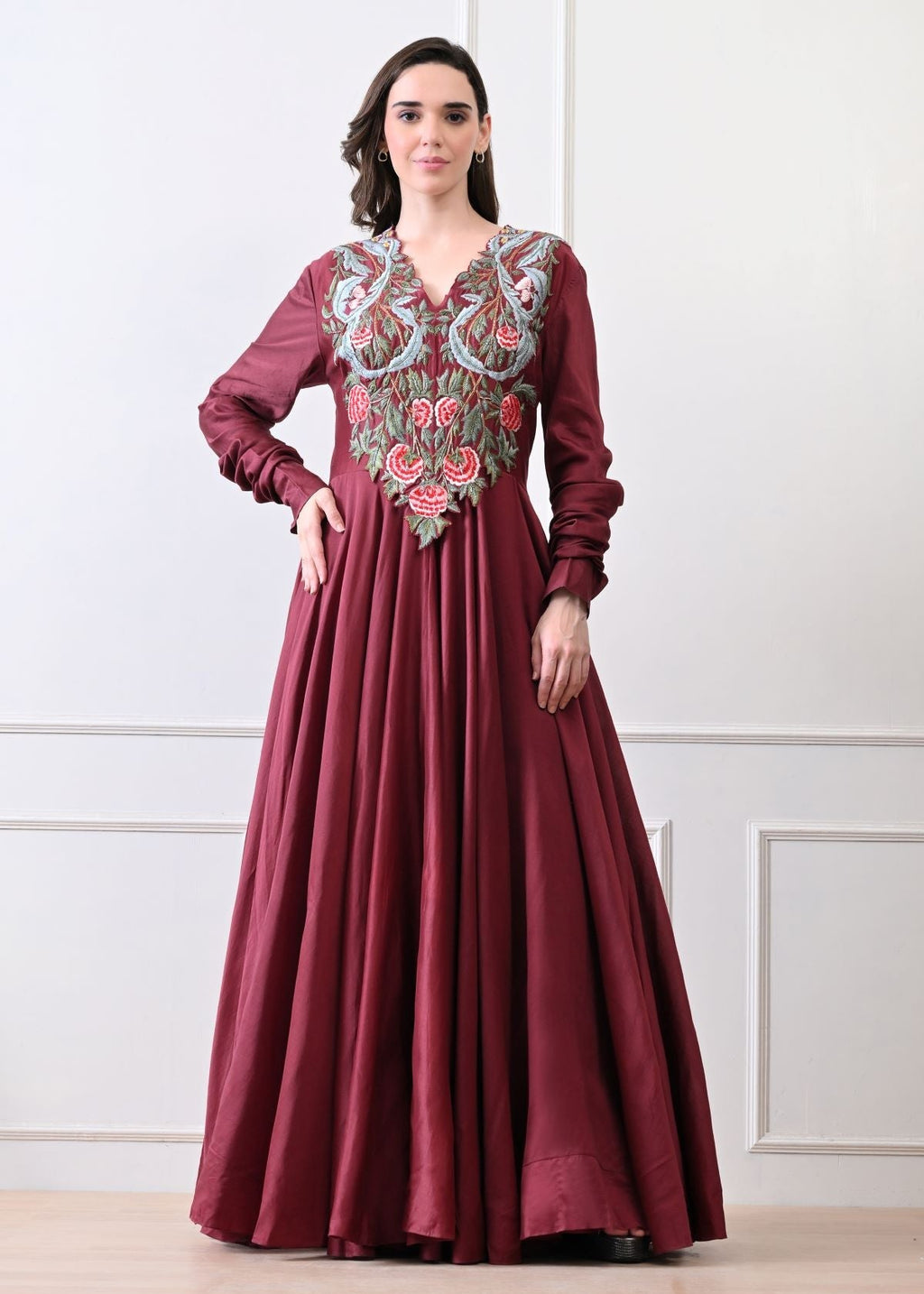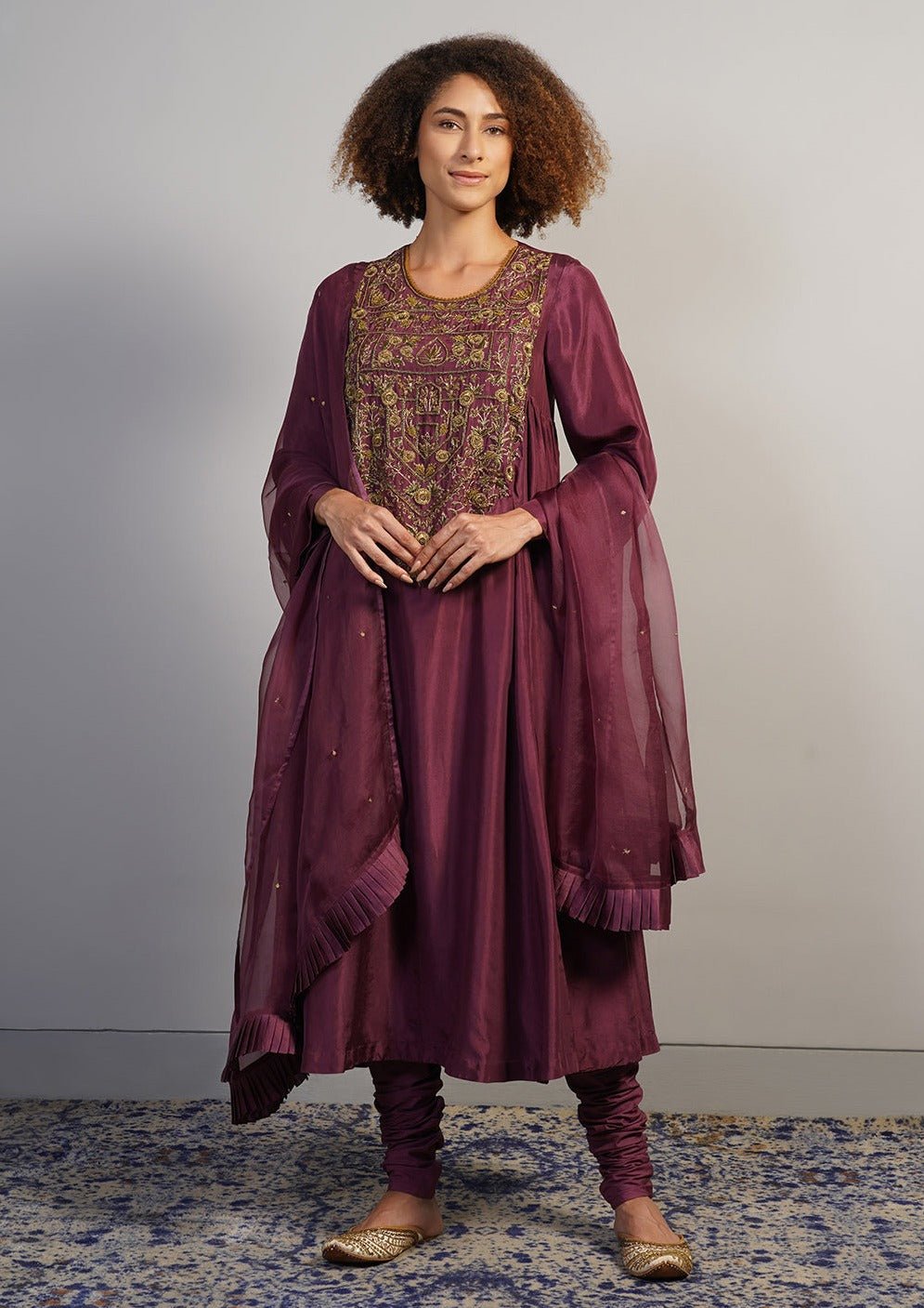 A beautiful deep wine A-line, round neck kurta set with gathers on the sides and intricate gold zardosi embroidery is paired with a cotton churidar. The matching organza Dupatta with frills on the borders adds to the beauty.
