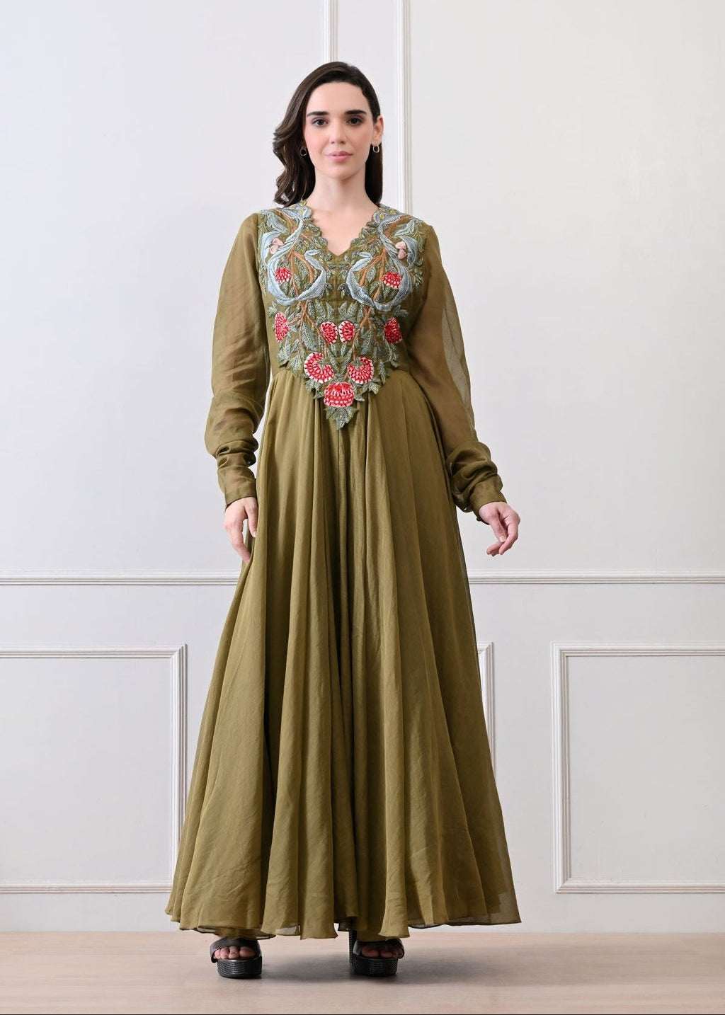 A black floor length lose-fitted gown with an embellished deep yoke neck line. It is given a matching cotton silk slip inside.