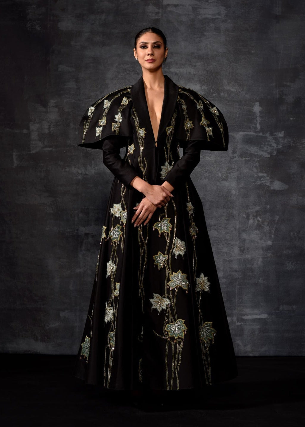 A black cotton silk floor-length dress that has a plunging V-neck with stylised collar. The beautiful silver zari embroidery on the garment is a delight to the eyes.