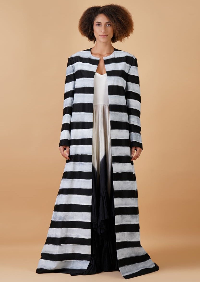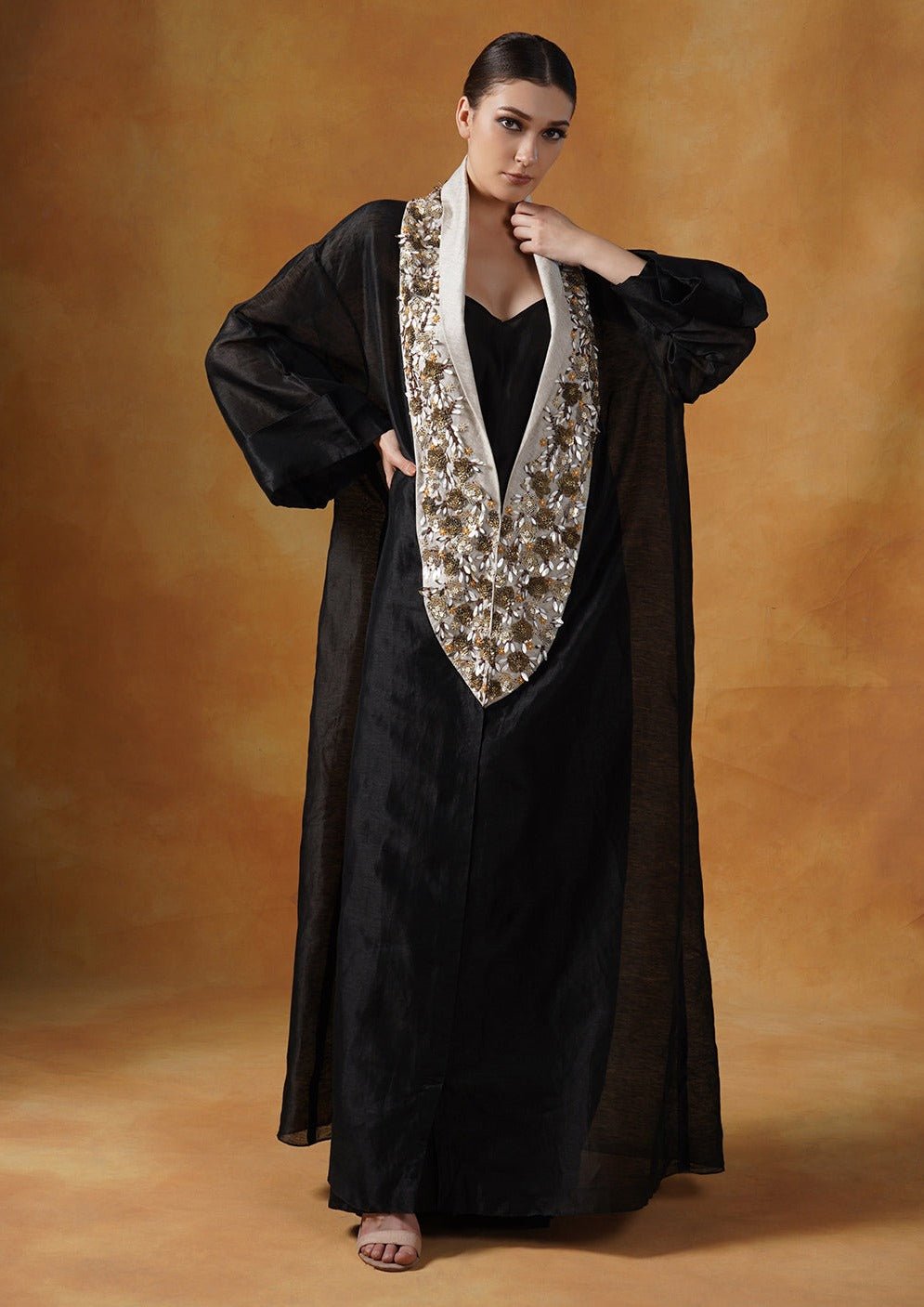 A black cotton silk floor-length jacket with block printed paired with embraided neck inner