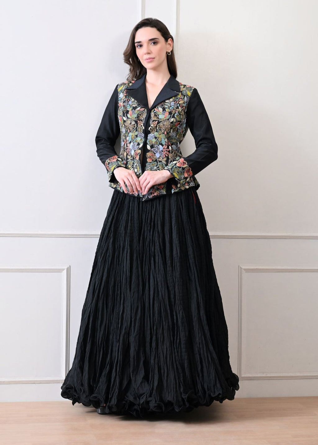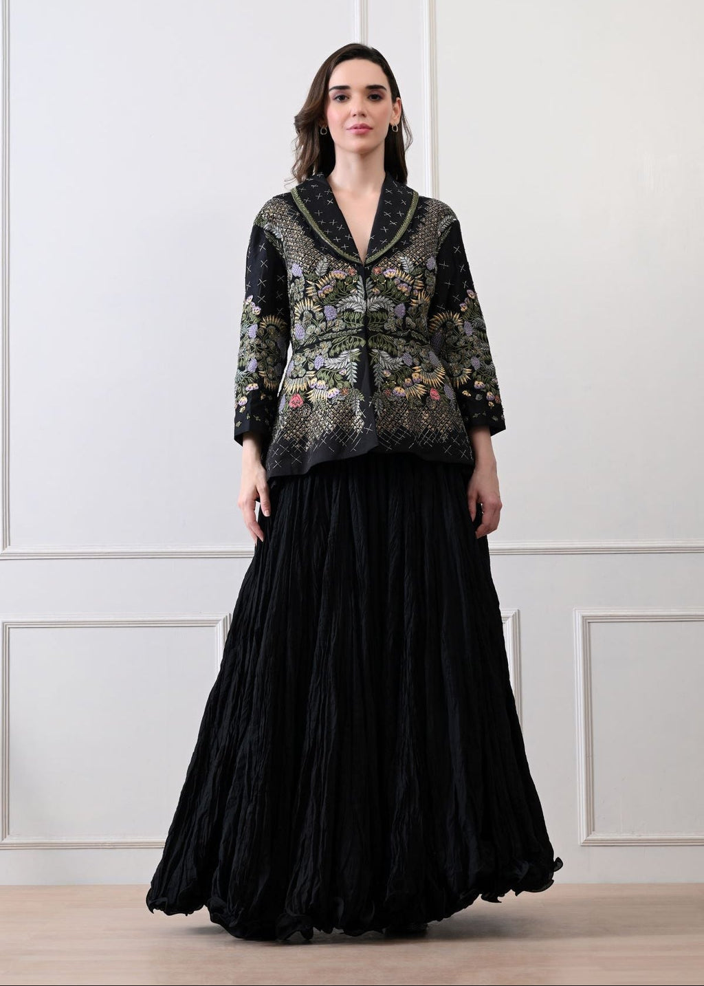 This tailored black jacket features intricate all-over embroidery in gold and jewel tones, inspired by botanical and geometric motifs. Designed with a structured silhouette, along with cruss cotton skirt