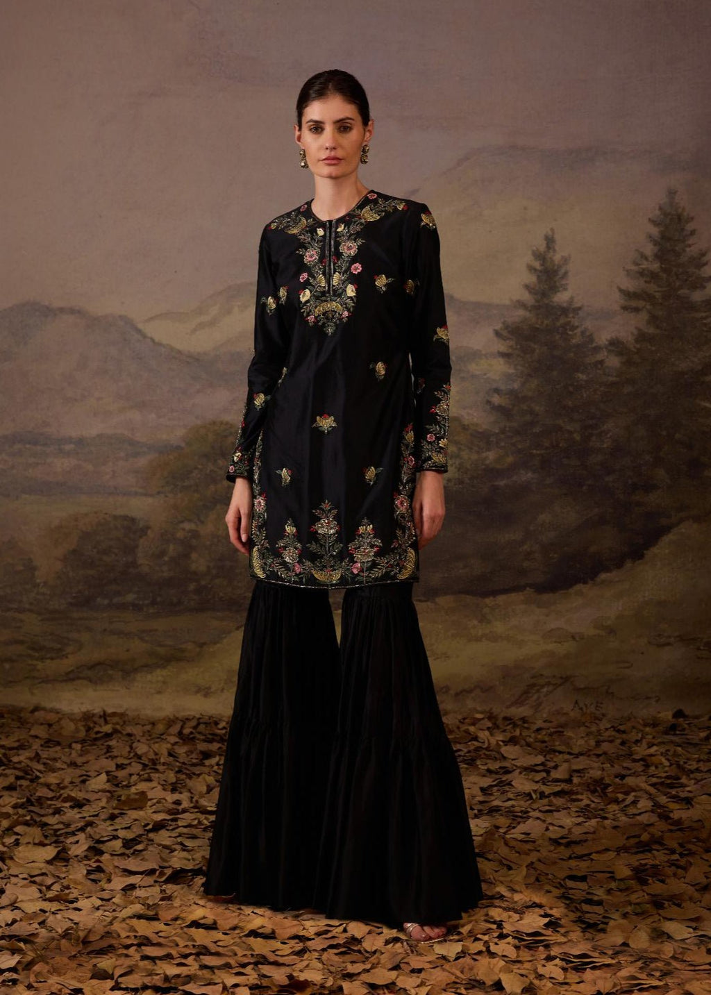 Exquisite black embroidered tunic featuring intricate floral patterns on the neckline, sleeves, and hem. Paired with graceful tiered gharara pants, this outfit offers a blend of traditional charm and modern flair