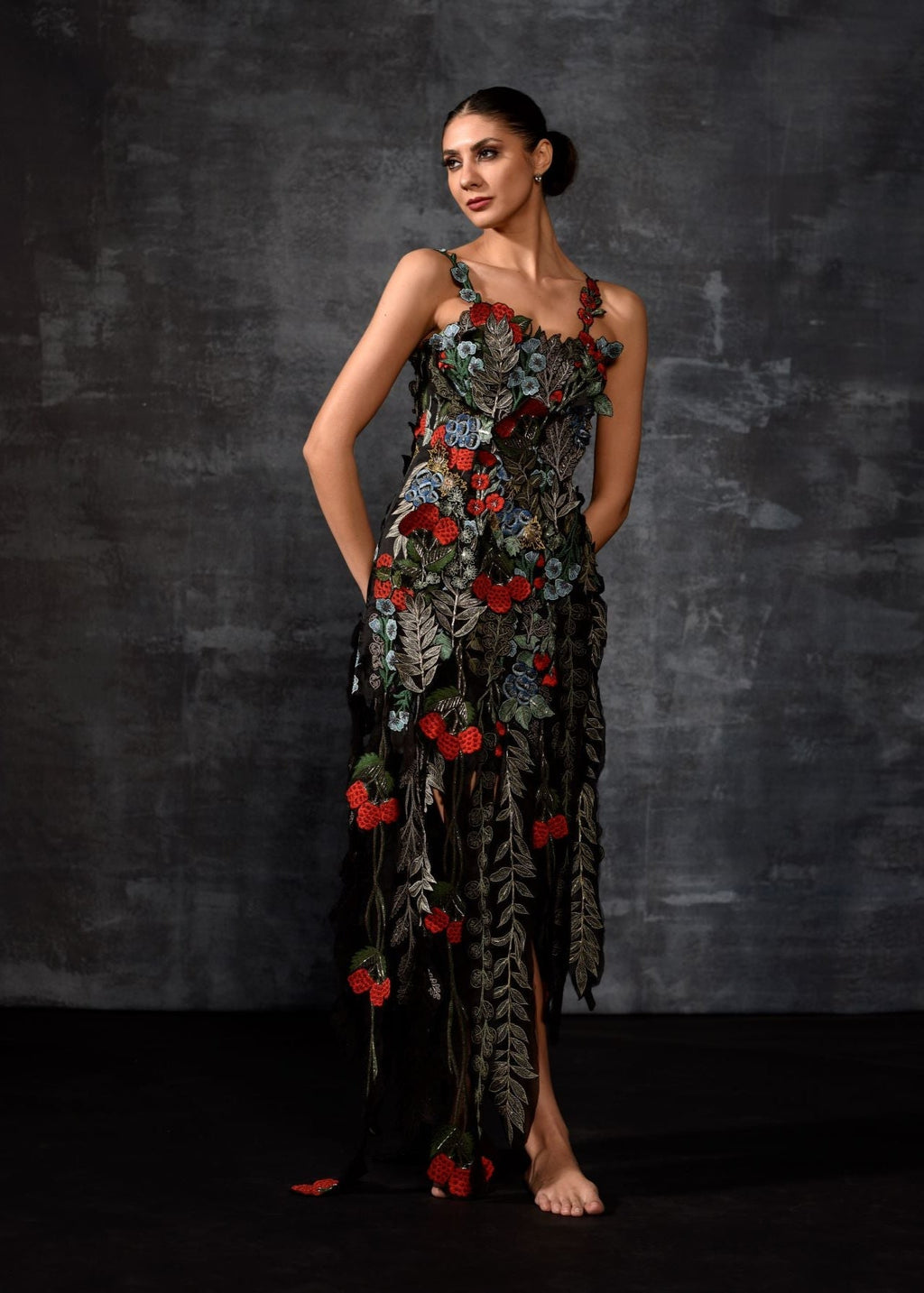 A black tube dress, adorned with beautiful zari thread embroidery and 3D flowers. Adding to the grace is the asymmetric ruffle at the bottom.