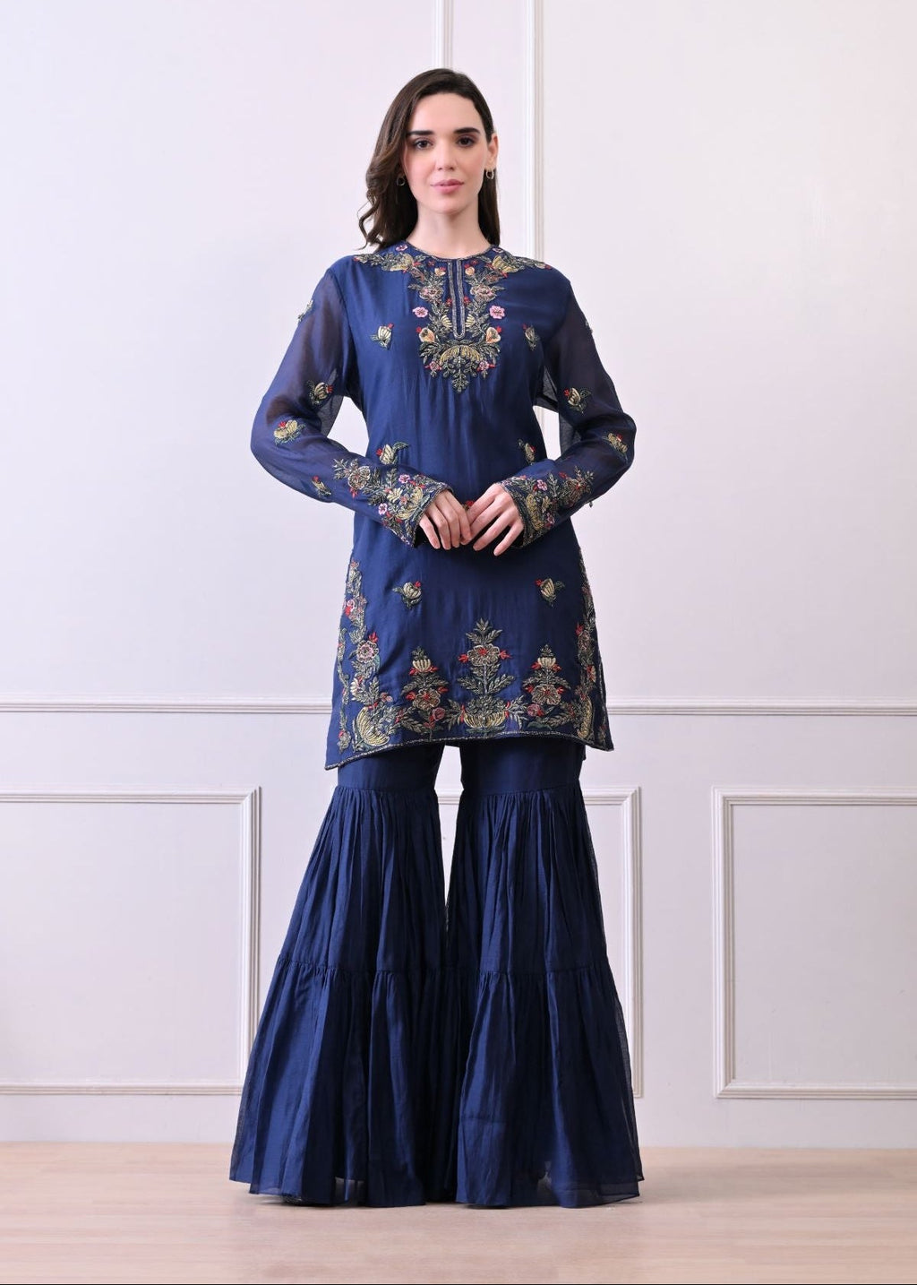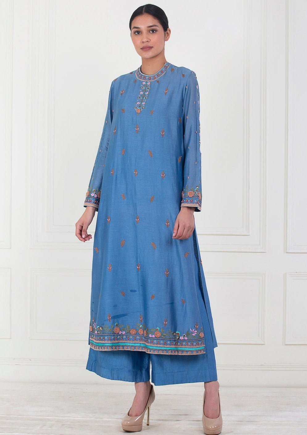 A beautifully embroidered cotton silk kurta set with palazzo pants.