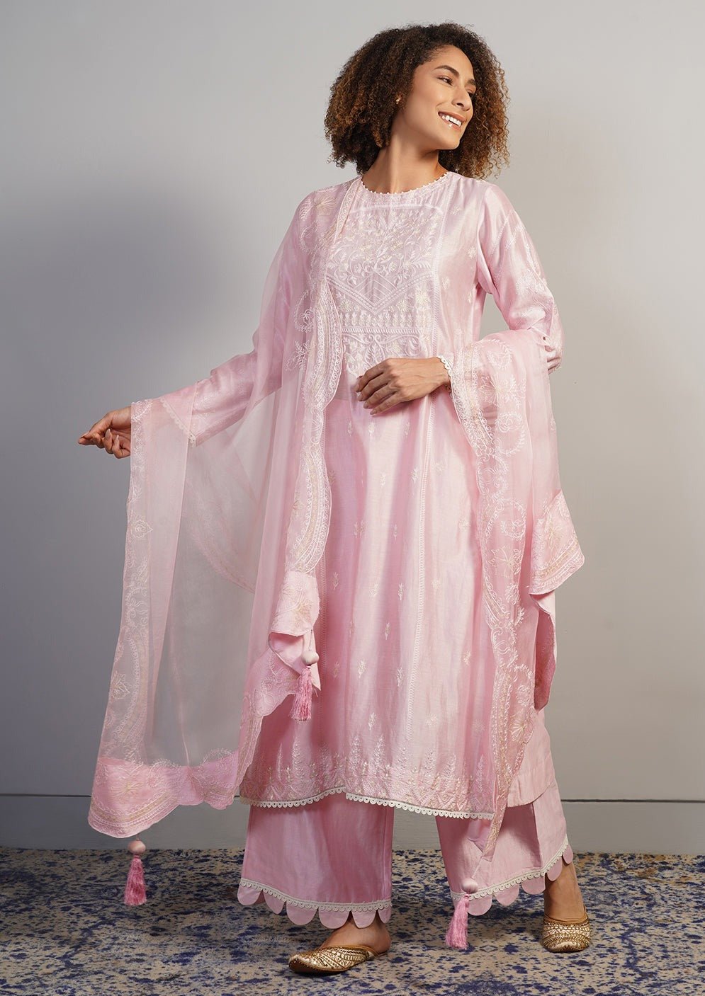 A beautiful baby pink cotton silk suit set in zero neck, adorned with intricate Aari work in white silk yarn. The pants are scalloped on the hem. Completing the ensemble is an organza Dupatta with Aari work and latkans on the b...