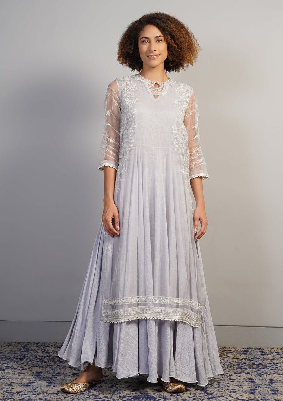 A beautiful layered ensemble with grey A-line cotton dress that is topped with a lovely organza shirt, intricately embroidered in off-white silk yarn.