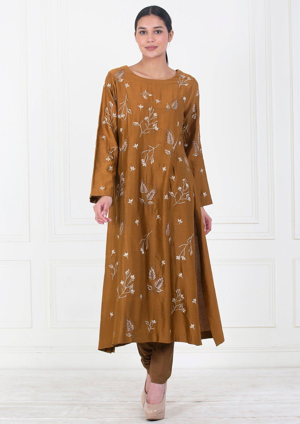 A brown cotton silk kurta that is embroidered in the front and is paired with cotton churidar.