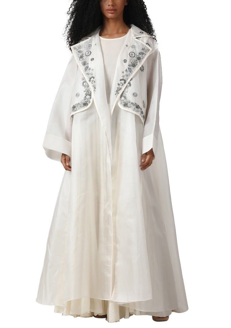 Ivory floor-length front open neckline & flare organza silk jacket with silver zardozi embroidery. Color: Ivory Fabric: Organza Silk Care Instructions: Dry Clean Only