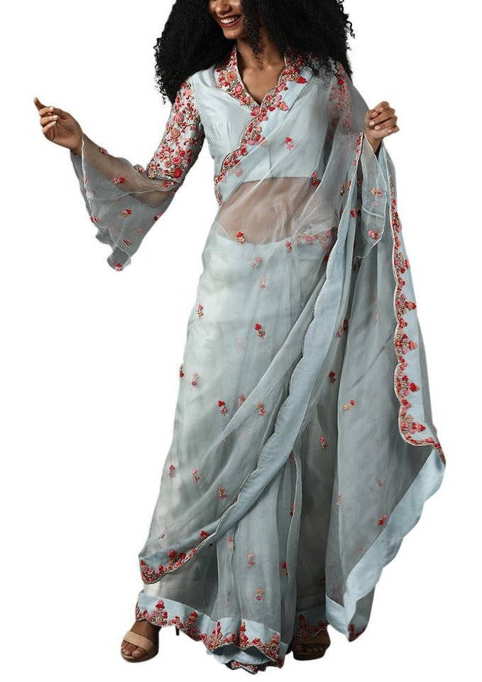 Light blue saree set floor-length v shape neckline cotton silk kaftan with black silk yarn embroidery.Color: Light BlueFabric: Organza & Cotton SilkCare Instructions: Dry Clean Only