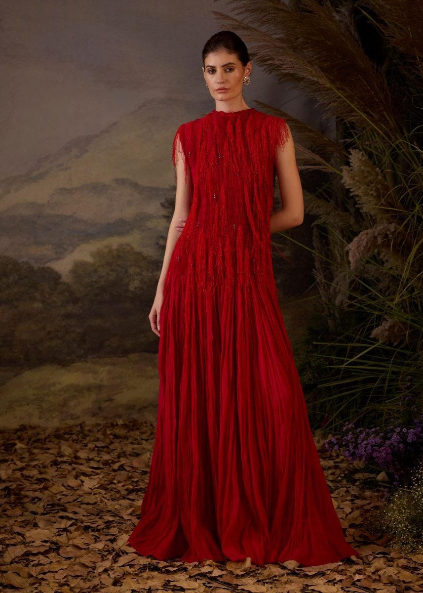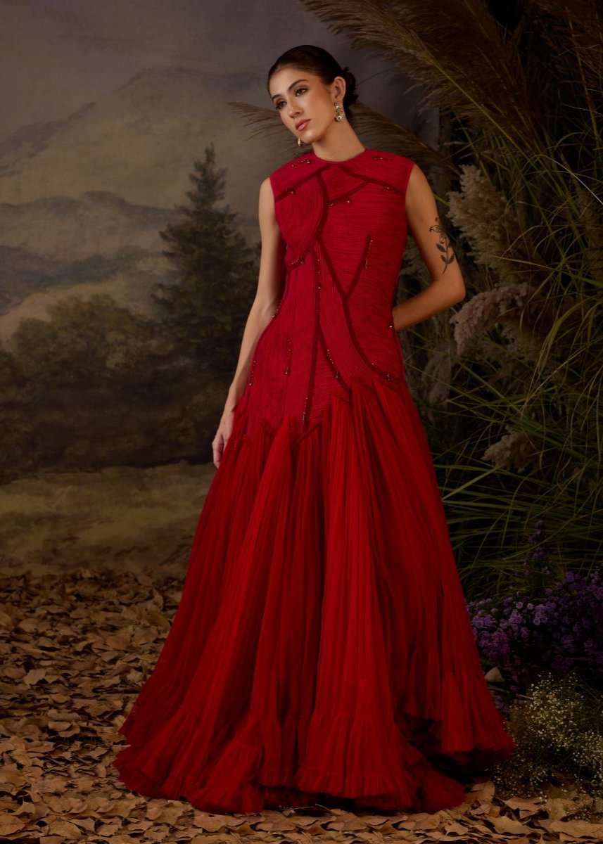 Featuring a red colored high-low gown in cotton silk and net base with dori and zardozi embroidery.