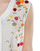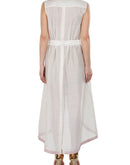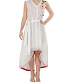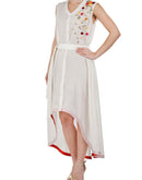 Ivory Cotton Silk Dress, that has an openable front, belt tie-up and is high lo, adorned with floral applique & thread work.